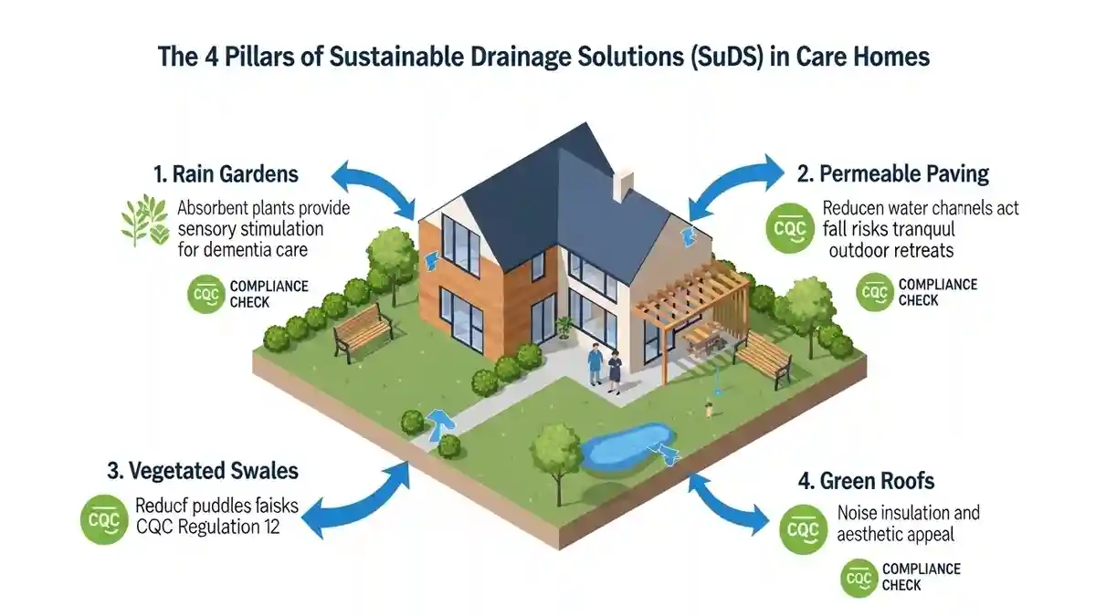 The future of sustainable drainage solutions CQC care home design is the integration of SuDS (Sustainable Drainage Systems). In Surbiton, Policy EN18 of the Local Plan encourages SuDS to manage surface water runoff, which often plagues the surrounding area.